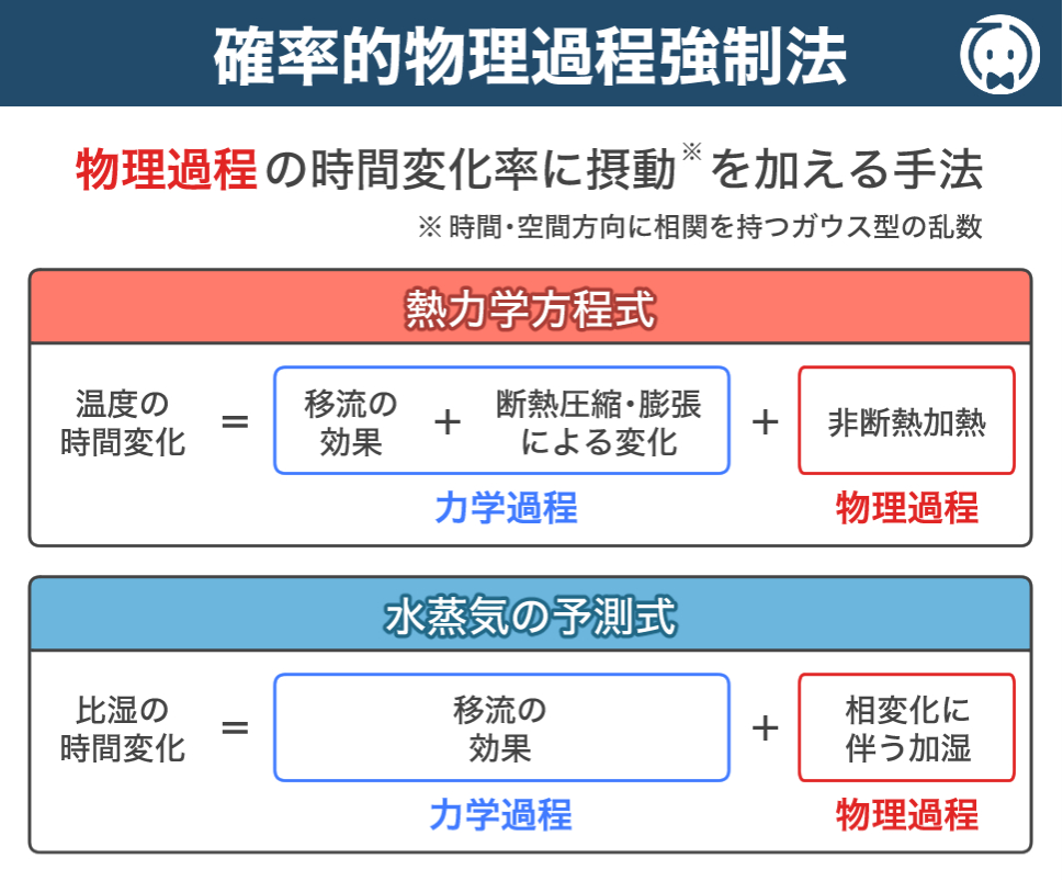 ①数値予報の誤差を予め把握するため、気象庁のメソアンサンブル予報では、初期値と側面境界値に少しずつ異なった誤差 (摂動) を加えた複数の予測を行っており、さらに 2023年3月からは、数値予報モデルの物理過程の不確実性を考慮するために、モデルアンサンブル手法の一つである確率的物理過程強制法が導入されている。