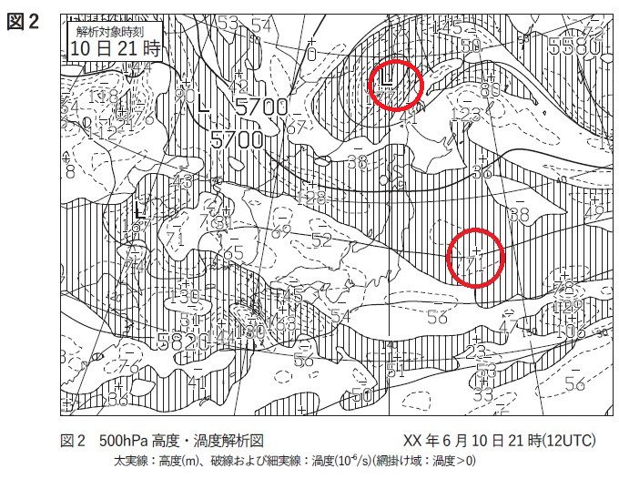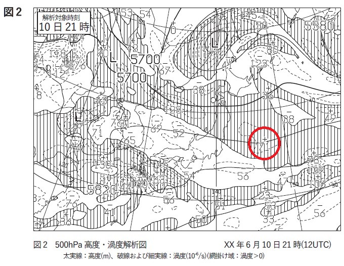 図2の500hPa解析図によると、(⑩)、中国東北区および華北に低気圧がある。華北の低気圧付近から四国の南にかけては正渦度域が広がっている。