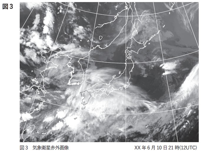 問1 図1は地上天気図、図2は500hPa解析図、図3は気象衛星画像であり、対象時刻はいずれも10日21時である。これらを用いて以下の問いに答えよ。