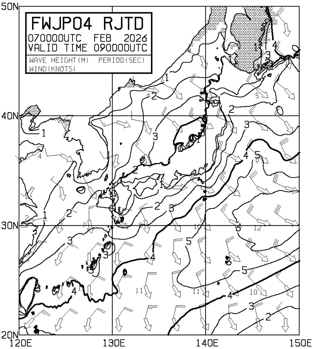 FWJP04(沿岸波浪予想図)が、フェリー欠航判断に最もふさわしい波浪図です。