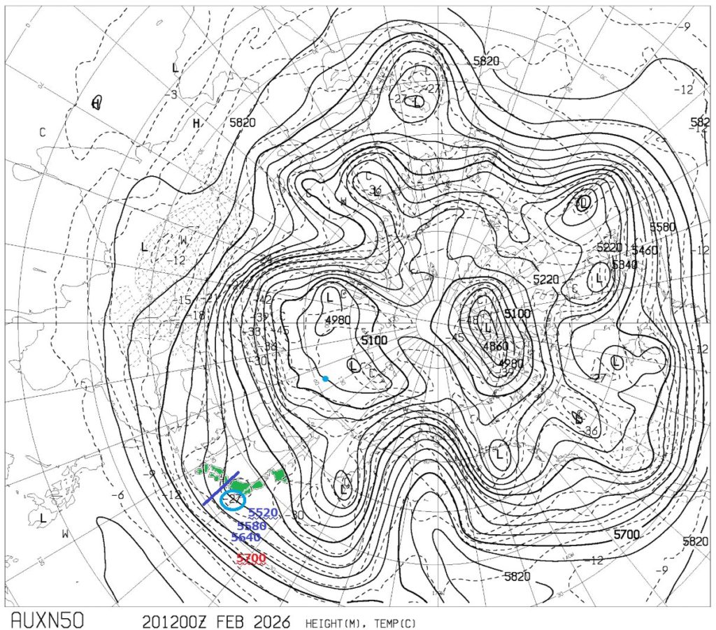 ※AUXN50で5520ⅿに-27℃を確認。青ラインのあたりにトラフがありそう。