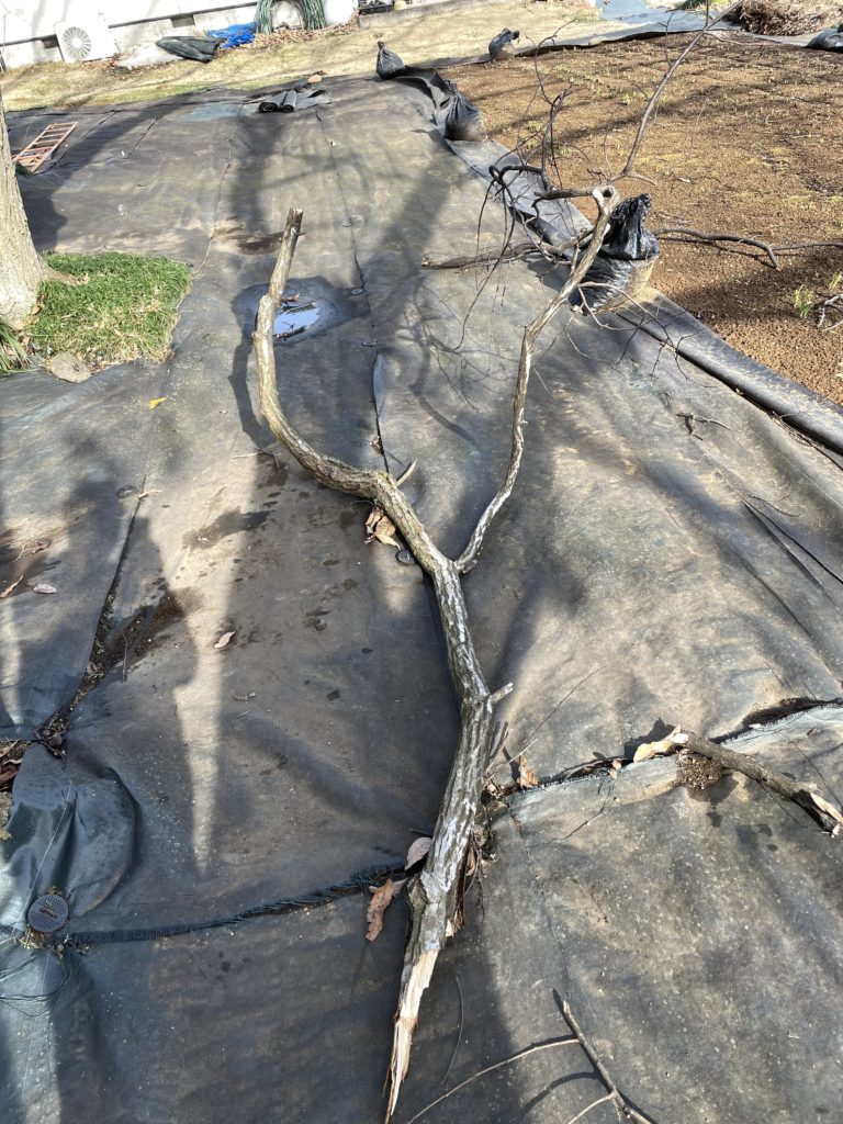 栗の木の枝払い 家庭菜園 2024.01.22 栗の木の下に枝が落ちていました。見上げると、まだ落ちていない枯れ枝が見えました。 ということで、園芸用脚立とバッテリーチェーンソーとバッテリー剪定ばさみの登場です。